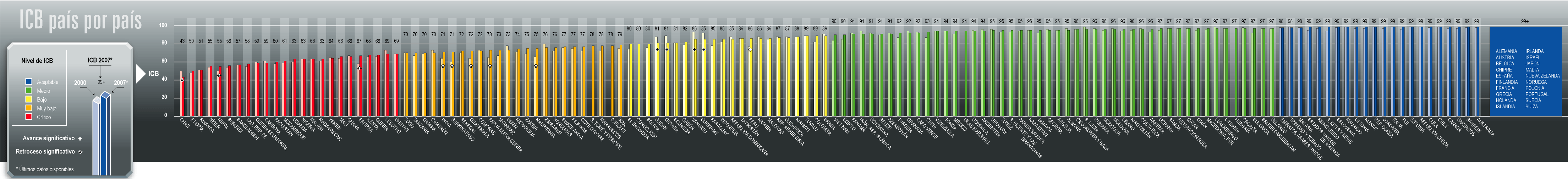 El ICB 2007 se calculó para 161 países. A fin de analizarlos, los países se agruparon en distintas categorías. Las situaciones más graves se concentran en los países con ICB crítico. En la categoría de ICB muy bajo se encuentran los países que también muestran obstáculos muy considerables para alcanzar el bienestar de la población. Los países con un ICB bajo están en un nivel intermedio de satisfacción de necesidades básicas y su desempeño varía en algunas dimensiones de desarrollo. Los países que han progresado para satisfacer la mayoría o todas las capacidades básicas de su población se ubican en las dos categorías con valores de ICB más altos (ICB medio y aceptable). La pertenencia a estos grupos no implica un nivel elevado de desarrollo sino más bien la satisfacción de los requerimientos esenciales mínimos a fin de avanzar hacia niveles más altos de bienestar.