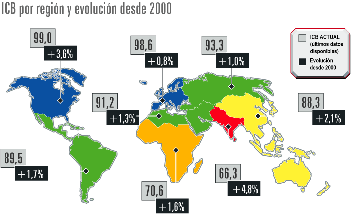 Los países que más han retrocedido en su ICB son mayoritariamente de África Subsahariana. La situación es preocupante ya que estos países se encuentran retrocediendo desde un nivel de ICB bajo, muy bajo e incluso crítico. Algunos países de Asia Oriental y el Pacífico y de América Latina y el Caribe, como Suriname o Guyana, también han sufrido el deterioro de sus capacidades básicas.