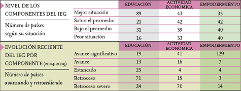 La educación es, por lejos, la dimensión en la que la brecha de género es menor en el mundo. Pese a los avances en aspectos referidos al empoderamiento – fundamentalmente en la participación política de las mujeres – no se logra alcanzar niveles mínimos aceptables en la inmensa mayoría de los países debido a los bajísimos niveles de partida. En cuanto la participación económica, la realidad es hoy peor que en 2008, con un alto porcentaje de países que han retrocedido.