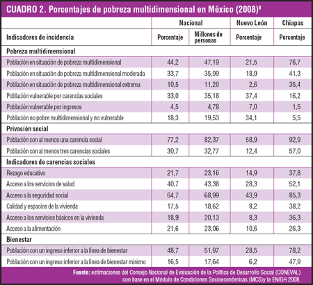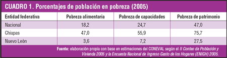 Si consideramos el Informe Ejecutivo para el Diagnóstico del Plan Nacional de Desarrollo 2007-2012 que preparó el Consejo Nacional de Evaluación de la Política de Desarrollo Social (CONEVAL)[5], encontramos una situación similar en las entidades federativas de Chiapas y Nuevo León; en el siguiente cuadro se presentan las estimaciones de la incidencia en pobreza alimentaria, pobreza de capacidades y pobreza de patrimonio[6] para ambas.