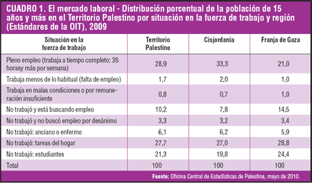 En el tercer trimestre de 2009, el desempleo en el TPO cayó al 31,4%, un leve descenso con relación al mismo período de 2008. Sin embargo, entre los jóvenes el desempleo era del 67%[3] . Sólo una de cada siete mujeres tenía trabajo. Según la Organización Mundial de la Salud (OMS), en mayo de 2008 por lo menos el 70% de las familias vivía con menos de USD 1 por día. En el tercer trimestre de 2008, el 51% de los palestinos vivía por debajo del umbral de pobreza (el 56% de la población de Gaza y el 48% de la de Cisjordania), con un 19% que vivía en la pobreza extrema.