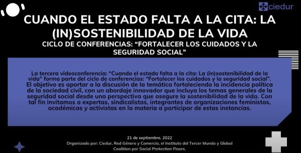 2 En abril de 2013 el Estado brasileño aprobó una importante enmienda constitucional que dio una nueva base jurídica al trabajo doméstico (Enmienda Constitucional N° 72 de 2013). Disponible en: https://www.ilo.org/wcmsp5/groups/public/---americas/---ro-lima/document... 3 Casas de tomar cuenta: Como no existen cuidados públicos para la primera infancia, ni escuelas de tiempo extendido para la niñez, los niños/as quedan a cargo del cuidado de una mujer sin ninguna formación para ello, en su casa de la favela sin condiciones adecuadas para ello (infraestructura, saneamiento, equipamiento); lo mismo sucede con los cuidados de niños/as con discapacidad. Las actividades son organizadas por Ciedur, Red de Género y Comercio, Social Watch y Global Coalition for Social Protection Floors. CICLO DE CONFERENCIAS: Con el objetivo de fortalecer la incidencia política de la sociedad civil en favor de la protección social en América del Sur realizamos un ciclo de conferencias con la participación de organizaciones diversas de la sociedad civil (e.g. feministas, sindical, ecuménicas, etc.) y expertas y expertos en la materia. En el marco de los temas generales de la seguridad social, de las nuevas propuestas, como los mínimos de protección social, y desde una perspectiva consistente en asegurar la sostenibilidad de la vida se plantea un abordaje innovador a la temática. La tercera videoconferencia “Cuando el Estado falta a la cita: La (in)sostenibilidad de la vida” tuvo lugar el miércoles 21 de setiembre de 2022. Participaron Mag. Graciela Rodríguez (Brasil), Soc. Rosario Aguirre (Uruguay), Dra Verónica Serafini (Paraguay) y Dra. Alison Vasconez (Ecuador). La moderación estuvo a cargo de Mag Soledad Salvador (Uruguay). Descargue el folleto en pdf y también aquí. Para recibir más información visite aquí. Las actividades son organizadas por Ciedur, Red de Género y Comercio, Social Watch y Global Coalition for Social Protection Floors.