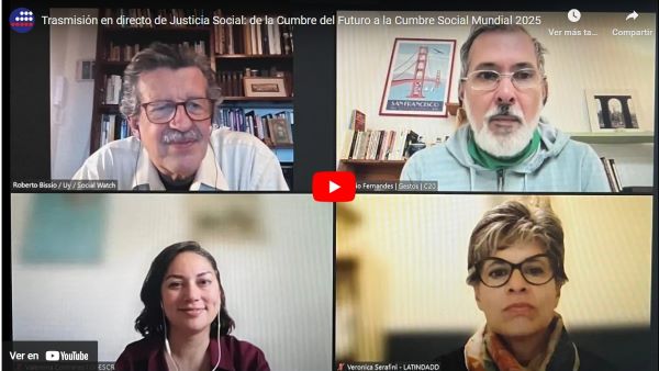 La grabación de la videoconferencia latinoamericana “Justicia social: de la Cumbre del Futuro a la Cumbre Social Mundial 2025” está en línea. La videoconferencia forma parte del ciclo Justicia Social y Gobernanza Internacional: América Latina ante la toma de decisiones mundial. Los oradores de la videoconferencia fueron Valentina Contreras (Líder de operaciones y punto focal de cuidados y seguridad social, GI-ESCR), Verónica Serafini (Especialista en macroeconomía y género, Latindadd), Claudio Fernandes (Gestos, Brasil). El evento fue moderado por Roberto Bissio (Coordinador, Social Watch).