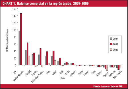 Todos los países árabes – ya sean exportadores de petróleo o no – sentirán el embate de la crisis en sus cuentas comerciales. Mientras los primeros se ven afectados por las fluctuaciones en el precio del petróleo y la caída de la demanda, los últimos verán una disminución de sus exportaciones a Europa y los países del Golfo debido a la disminución de la demanda, y todos ellos deberán limitar sus importaciones. Junto con los elevados costos relativos de la mayoría de las importaciones necesarias, como los productos alimenticios, el impacto en el equilibrio comercial de la región será dramático.