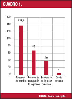 Como indica la tabla de abajo, la economía argelina está bien posicionada para hacer frente a la crisis financiera y económica global, al menos durante los próximos dos años, debido a su escasa exposición a los mercados financieros internacionales, una gestión prudente de las reservas de cambio (el porcentaje de rendimiento realizado alcanzó un 4.6% en 2007), el ahorro de una parte de las adiciones presupuestarias (20% del PIB por término medio anual para los años 2005-2007) y la prioridad otorgada a la financiación interna de la economía (en dinares, la moneda nacional) debido al exceso estructural de liquidez.
