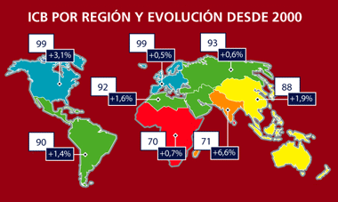 | AMÉRICA LATINA Y CARIBE: Avance leve, con algunos países que retroceden. EUROPA Y AMÉRICA DEL NORTE: Nivel aceptable de ICB alcanzado antes de 2000. ASIA MERIDIONAL: Avance significativo. India, mejorando rápidamente, en el ICB, eleva el desempeño de la región. ASIA CENTRAL: Avance leve, con algunos países presentando retroceso. MEDIO ORIENTE Y NORTE DE ÁFRICA: Avance leve. ASIA ORIENTAL Y PACÍFICO: Avance leve. No hay datos para medir la evolución reciente de China. ÁFRICA SUBSAHARIANA: En promedio, progreso extremadamente lento, con países que retroceden de niveles que ya eran bajos, muy bajos o críticos. Al paso actual, la región necesitará más de un siglo para alcanzar niveles aceptables en el ICB. |