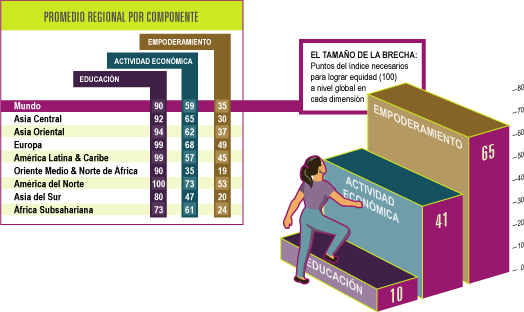 El escalón que falta para alcanzar la equidad de género en educación en todo el mundo no es demasiado grande. Sin embargo, son más los países que retroceden en educación que los que progresan. Un mayor número de países muestra progreso significativo en la actividad económica, pero es también el número de los que experimentan retroceso y, por tanto, la tendencia global no está clara. La evolución en empoderamiento parece promisoria, ya que la mayoría de los países está mostrando progreso. De todos modos, es por lejos la mayor brecha a superar.