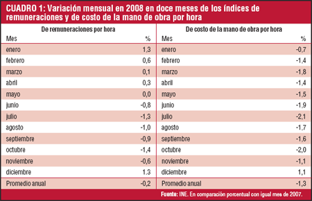 La evolución del índice general de remuneraciones por hora y de costo de la mano de obra, que elabora mensualmente el Instituto Nacional de Estadísticas, evidencia claramente las consecuencias. El primero fue negativo desde junio de 2008, luego de no haber experimentado modificaciones durante mayo, pero menos que el segundo, que mira la evolución de las remuneraciones desde la perspectiva del empresario.