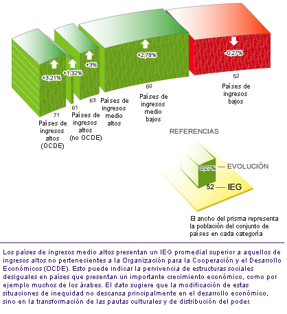 Observando la Tabla 7, diríamos que la riqueza de los países se relaciona con su nivel de desigualdad de género. Sin embargo, los países de ingresos medio altos presentan un IEG promedial superior a aquellos de ingresos altos no pertenecientes a la Organización para la Cooperación y el Desarrollo Económicos (OCDE). Esto puede indicar la pervivencia de estructuras sociales desiguales en países que presentan un importante crecimiento económico, como por ejemplo muchos de los árabes. El dato sugiere que la modificación de estas situaciones de inequidad no descansa principalmente en el desarrollo económico, sino en la transformación de las pautas culturales y de distribución del poder.