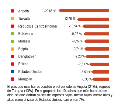 El pais que mas ha retrocedido en el periodo es Angola (21%), seguido de Turquía (13%). En el grupo de los 10 paises que más han retrocedido, se encuentran países de ingresos bajos, medio bajos, medio altos y altos como el caso de Estados Unidos, casi en un 7%.
