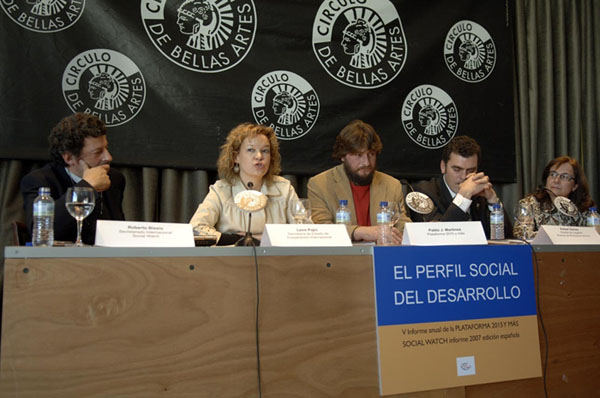 La Plataforma 2015 y más realizó el lanzamiento de la primera edición española del Informe Social Watch 2007 el miércoles 12 de diciembre, en el Círculo de Bellas Artes de Madrid. Elevento contó con la participación de La Alianza de Municipios del Sur deMadrid; Leire Pajín Iraola, de la Secretaría de Estado de CooperaciónInternacional; Roberto Bissio, del Secretariado Internacional de Social Watch yMaría Eugenia Callejón de la Plataforma 2015 y más. Ver invitacióny reseña de prensa. Ver informe completo
