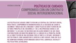 Las políticas de cuidado constituyen un eje central del contrato social, Muestran el compromiso intergeneracional de la sociedad de cuidar a los niños y niñas que en el mediano y largo plazo se constituirán en los actores principales del desarrollo, y de la reciprocidad debida a los enfermos y a los adultos mayores que en algún momento de sus vidas contribuyeron con nuestro bienestar. El cuidado es la principal razón de la constitución de una sociedad. Por lo tanto, el estado –sociedad y sector público- debe garantizar el derecho a ser cuidado, para que ello no signifique menores oportunidades educativas, laborales, sociales y políticas para las mujeres. » |