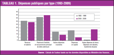 Une description des dépenses publiques montre que le service de la dette et les services publics ont consommé le gros des ressources publiques entre 1997 et 2006. Cependant les dépenses en éducation et en santé n’ont représenté que 15 % et 6 % respectivement. De plus, 88 % des dépenses en éducation ont été destinées au paiement des salaires des fonctionnaires publics et 86 % des ressources de santé ont financé l’hospitalisation d’individus dans des centres privés de santé[10]. Les ressources destinées au développement de ces secteurs ont été minimales.