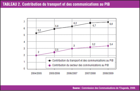 L'Ouganda a montré un grand intérêt pour l'intégration des TIC dans ses priorités de développement depuis le milieu des années 90. En même temps, pendant plus de dix ans, le pays a connu une forte croissance économique soutenue. Le budget 2009 - 2010 a montré une croissance économique réelle de 9,4 % sur l'année fiscale 2008 - 2009, que l'on peut comparer au 10,2 % obtenu en 2007-2008.[1]. D'après les données officielles, le Produit intérieur brut (PIB) a augmenté de 6,7 % sur l'année fiscale 2008-2009, soit une diminution par rapport à l'année 2007-2008, où la croissance a été de 8,3 % (voir graphique 1). De toutes façons, au vu de la crise économique mondiale, cette croissance a été remarquable, et peut s’attribuer à la diversification des secteurs de l'exportation et des services.[2]