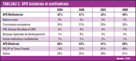 Bien que la plupart de l´APD soit octroyée de manière bilatérale, depuis 2002 des efforts importants ont été faits pour augmenter les contributions multilatérales qui ont représenté 43 % du total de l'APD portugaise entre 2005 et 2008, face à 27,4 % en 1990 et 34 % en 2000.