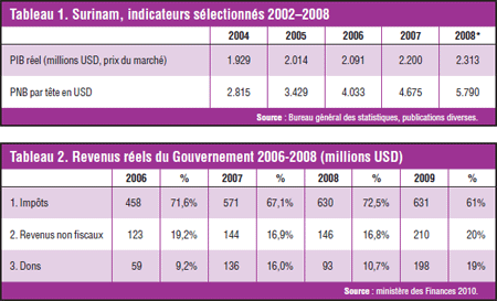 Comme cela apparaît ci-dessous, on attendait que l'assistance des donateurs joue un rôle important (19 %) dans le total des revenus du Gouvernement en 2009. Le Plan pluriannuel de développement 2006-2011 du Suriname prévoit que 50% de son financement proviendra de l’Investissement direct étranger (IDE)[10]. Les revenus du pays devront toutefois augmenter pour que l'on puisse accéder à un développement et à une croissance indépendants. L'assiette fiscale doit être élargie par l'introduction, par exemple, d'un impôt sur le patrimoine, ce qui n’a pas été fait pour des raisons politiques.