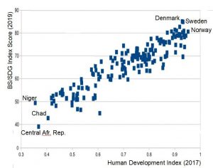 Denmark, Sweden and Finland are the top ranking countries in terms of sustainable development, while Niger, Chad and the Central African Republic are the worse performers, according to the recently launched Sustainable Development Report 2019, by the Bertelsmann Foundation of Germany and the Sustainable Development Solutions Network, based in New York and Paris.* The Bertelsmann-SDSN report includes 17 “dashboards” with indicators selected by the authors for each of the 17 Sustainable Development Goals, and a Global SDG Index that summarizes them in a single number and allows for the ranking of the 162 countries for which enough data are available. The numbers of the BS/SDG Index are surprisingly similar to those of the Human Development Index (HDI) that UNDP publishes every year (see graph below) with a correlation coefficient of 0.91 (where 1.0 indicates perfect correlation and 0.0 means no relation at all). In other words, if you know a country’s HDI value, you can forecast its BS/SDG ranking with 91 percent precision. Thus, the new index only adds minor details to what we already know. BS/SDG index and HDI are highly correlated