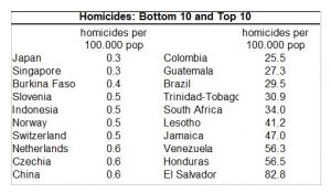 Source: Graph by the author with data from the BS/SDG Index and UNDP’s HDI. This high correlation was not to be expected if we remember that the HDI reflects only three factors (income, health and education), while the BS/SDG index intends to reflect all of the goals, from the well-being and gender dimensions of poverty, hunger, health and education (Goals 1 to 5) to environment (SDGs 12 to 15), governance (SDG 16) and implementation (SDG 17). The 2030 Agenda that frames the SDGs calls itself “transformational” in its very title and has been hailed as a “paradigm change”. Shouldn’t that be reflected in an index that claims to measure progress towards achieving it? Development used to be conceived as a synonym of economic growth and the OECD still “graduates” countries out of their condition of potential recipients of ODA based on the World Bank threshold between high middle income and high income countries. In the nineties, the HDI nuanced per capita GDP by adding well-being considerations and showing that countries with similar income levels could have very different “human development” results. Now “sustainable development” further expands the concept, introducing inequalities, governance and the environment into the picture. For example, one of the new indicators incorporated in the SDGs and not previously considered in development indexes is the number of homicides per 100,000 deaths. The ranking of countries in that indicator does not correlate at all with per capita income or HDI and among the ten best ‘performers’ we find some of the richest and some of the poorest countries in the world. Among the “bottom ten”, the countries with the highest proportion of homicides, mostly middle income countries are found, with extreme inequalities being the only obvious common denominator.