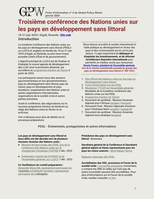 La troisième Conférence des Nations unies sur les pays en développement sans littoral (PDSL3 ou LLDC3 en anglais) se tiendra du 18 au 21 juin 2024 à Kigali, au Rwanda, au plus haut niveau possible (chefs d'État et de gouvernement). L'objectif principal du LLDC3 est de finaliser et d'adopter le nouvel agenda de développement des LLDC pour la prochaine décennie, qui succédera au programme d'action de Vienne à partir de 2024. Cette fiche d'information de Global Policy Watch explore le processus et les négociations en cours, ainsi que les différentes priorités révélées dans les déclarations des États membres. Téléchargez ce briefing (version pdf) Source : Global Policy Watch (GPW).