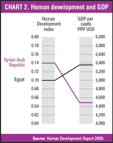 The 2009 Human Development Report ranks Egypt 82nd among 135 countries for which the index has been calculated. The poverty index measures severe health deprivation by the proportion of people who are not expected to survive to age 40. Education is measured by the adult illiteracy rate. And a decent standard of living is measured by the un-weighted average of people not using an improved water source and the proportion of children under age five who are underweight for their age. Chart 1 shows the values for these variables for Egypt and compares them to other countries".