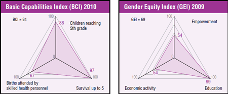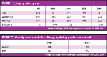 Millennium Development Goal number 3 is to promote gender equality and the empowerment of women by 2015. There has been some progress, for example in literacy in the 15 to 24 age bracket , where the rate among women increased from 88.4% in 1990 to 95.3% in 2009, but women’s progress in the last three years has been slower than progress among men.