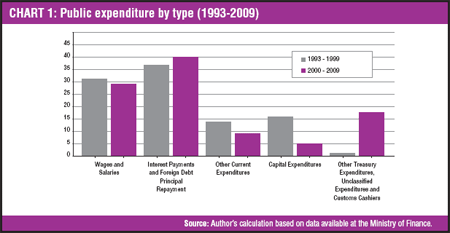 A breakdown of public expenditure shows that debt servicing and public services consumed the bulk of public resources between 1997 and 2006. Yet spending on education and health represented only 15% and 6%, respectively. Furthermore 88% of spending on education went as wages for public servants while 86% of the resources allocated to health financed hospitalization of individuals in private commercial hospitals.[10] Resources allocated for the development of these two sectors were minimal.