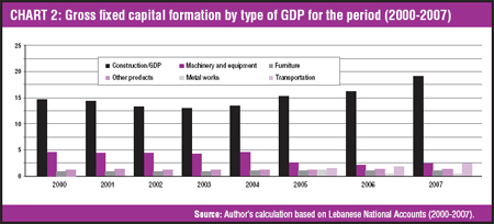 Between 2000 and 2007 Lebanon attracted important amounts of FDI – for example, 28% of the overall FDI that flowed to the Economic and Social Commission for Western Asia region in 2003 – with the highest FDI-to-GDP ratio.[14] However, FDI is rarely oriented to the real economic sector (in which good and services are produced); instead, real estate, banking and tourism consume most of it (almost 90% in 2007).[15] Construction permits jumped from 9 million square metres in 2007 to 16.1 million in 2008.[16] This correlates with the growth of USD 918 million in the inflow of Arab FDI between 2007 and 2008.[17] Likewise the value of transactions in this sector grew an average of 17.6% per year for the period 2003-2008 (and 54.4% in 2008 alone).[18] Chart 2 shows that most of the gross capital formation in 2000-2007 was generated by the construction sector. However these profits are exempt from taxes.