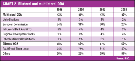 Bilateral ODA is devoted mainly to former Portuguese colonies, the PALOP countries[6] and Timor Leste. Although most of these are in Sub-Saharan Africa (except for Timor Leste) and with the exception of Cape Verde, are categorized as least developed countries, island States (Timor Leste, Cape Verde) or post-conflict States[7], it is their historical, linguistic and cultural bonds with Portugal that constitute the criteria for selecting them.