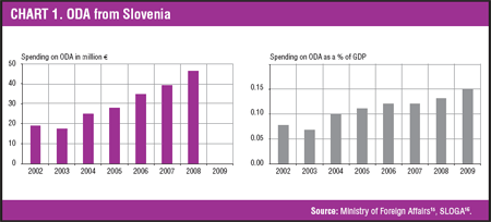 Slovenia is supposed to reach the target goal of 0.17% of GDP in 2010 and 0.33% in 2015, according to the accepted commitments under the Monterrey Agreement and European Consensus on Development. These goals are also included in the Resolution on International Development Cooperation until 2015 (adopted by the National Assembly on 11 July 2008) and the Law on International Development Cooperation.[6] However, that commitment will be difficult to uphold in the current situation, with national budget cuts in almost every sector.