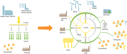 Figure II.7.2: From conventional centralized to smart, distributed renewable, people-centered energy models