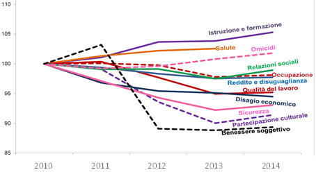 In general we can say that through the recent economic crisis most dimensions of well-being in Italy have suffered some deterioration. Levels of income and employment decreased as expected, yet a more intense worsening has been registered for other, linked phenomena such as the rise of petty crime and the decline of cultural activities. This shows how the crisis had an impact not only on the economic life but also on the social fabric.