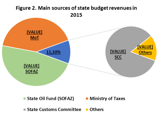 Finally, Figure 2 demonstrates that three institutions (SOFAZ, the Ministry of Taxes and the State Customs Committee) “carved out” the vast majority of fiscal revenues (98.2%), but the dominance of SOFAZ as a commodity-based extra-budgetary saving and stabilization fund jeopardizes fiscal sustainability in the long term. According to an independent budget review by a local think-tank, Support for Economic Initiatives, “the amount of transfers to the state budget from the State Oil Fund [has been] significantly reduced. The role of direct payments from the oil sector in the formation of state budget revenues has [been] considerably reduced in both absolute and relative terms.”2