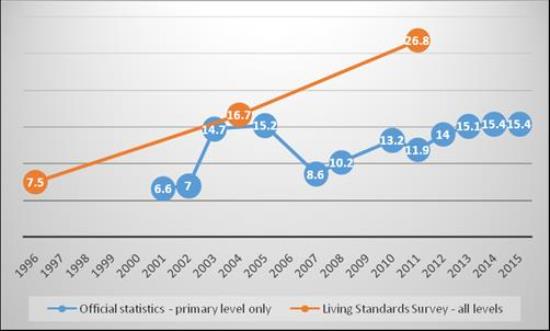 Percentage of children attending private school (UNESCO, primary level) and the Living Standard Survey (all levels)