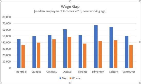 New Census numbers released this week show that overall incomes have risen in the past ten years in Canada. This is excellent news. Economic growth driven by rising wages is growth we can feel, growth that translates into a better life. However, not all Canadians are having the same experience. When you look at different parts of Canada, and different Canadians, you see some important differences. This Census release doesn’t include the differences in income and poverty experienced by racialized, indigenous, and immigrant groups. For that information, we have to wait another month. However, you can already see differences in the wages of men and women and very different levels of poverty depending on which city you live in (or if you live in a city at all).