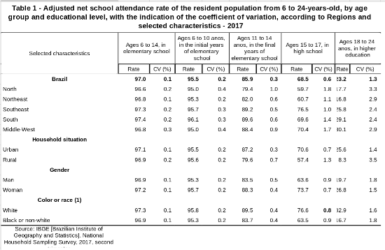 Therefore we will analyze the targets, correlated to the PNE targets: The first target of SDG 4 is the universalization of primary and secondary education for all girls and boys, offering quality education. At PNE, target 3 indicates that by 2016 Brazil should universalize school attendance for the entire population aged between 15 and 17, and by the end of its term, the net enrollment rate in high school would reach 85%. As can be seen in table 1, which shows net school attendance data3, by 2017 only 68% of the population aged between 15 and 17 was attending high school. In addition, if we look at the disaggregated data, we realize that in the North and Northeast the percentage is around 60%, or by race/color, the blacks and non-whites are 63%, that is, below the national average. We can conclude that in addition to Brazil still having a large gross number of adolescents out of school, there are several of them in an age/grade distortion situation, which should have been in high school, but have not yet managed to get out of the elementary school. For a clear picture of the distortion: the gross enrollment rate, in the range of the 15 and 17-years-old, is 87%4, against 68% of net enrollment, which means that about 20% of the people in this age group are in age/grade distortion.