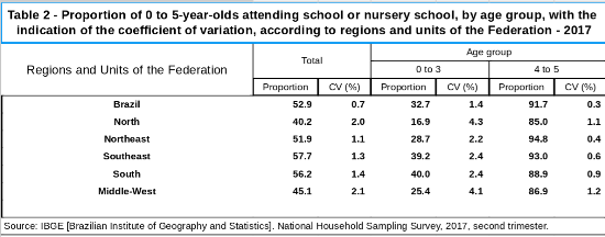 Target 4.2 relates to early childhood, which includes nursery school and pre-school. In PNE, there are targets for this stage; however, they are moving forward at very slow steps. With regard to pre-school, progress has been made, although universalization has been planned for 2016, there is still a large contingent outside of school, especially if we look at the data by region (see table 2). In the North, for example, 15% of children are still out of pre-school. As for nursery schools, the situation is even more critical, the data for Brazil point to an attendance rate at 32.7%, while in the North region it is only 16.9%. Part of this problem is because these stages are under the responsibility of municipalities, which, with the exception of a few Brazilian cities with good tax collection capacity, are mostly not able to afford the maintenance of nursery schools, with higher costs due to the characteristics of the service provided. The Federal Government should have to contribute with more resources, but with the austerity measures taken since the approval of the Constitutional Amendment 241 to cap public expenditure, which imposes a freeze on investments for 20 years, resources for social policies are shrinking.