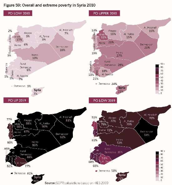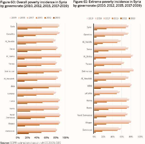 Since 2014, government economic policies adapted more neoliberal policies, through a dramatic increase of prices of bread and other basic food items and oil derivatives in addition to the raising of fees and indirect taxes. These policies continued in 2015 and 2016 and to a less extent in 2017. By the end of 2019, most Syrians had become trapped in poverty, suffering from multidimensional deprivation, not only just money metric deprivation.