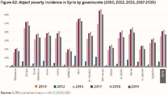 Abject poverty as a proxy for deprivation of food was less than 1 per cent in Syria 2010; during the conflict the Syrians began to experience widespread abject poverty - in 2012 it reached 5.1 per cent, and then rose exponentially to 44.9 per cent 2016, and then reduced somewhat to 37 per cent in 2019 (Figure 62). The increase in food prices in different regions created extreme barriers for people to access enough food to meet recommended caloric intake amounts. The years 2016 to 2019 in particular were marked by serious and widespread deprivation. This is a process of de-humanizing and de-empowering of people that continues and will have a major impact on future generations.