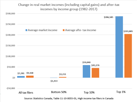 6 Statistics Canada, Table 11-10-0055-01, High income tax filers in Canada. Among the top one percent, earnings (including capital gains) has effectively doubled since 1982, reaching $581,700 in 2017.