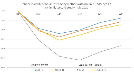 Employment loss is only part of the picture. When the pandemic hit, there was also a significant rise in the number of mothers with children under 12 working less than half of their usual hours, more than doubling between February and April. The share of mothers working reduced hours has fallen slowly through the spring, but still exceeds February levels by 50%, effecting one in ten working mothers as of July.