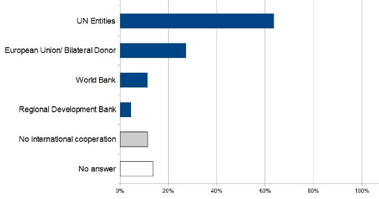 The issues mentioned only once were (in alphabetical order): Africa, Anti-corruption, Body autonomy, Business and human rights, Community development, Cultural heritage, Defense of national territory, Emergency response, Right to the city, Rights of minorities/diversities, Sensitization, Tax justice, Transparency and Youth. International CooperationA total of 33 respondents (75% of the total from programme countries) are or have been involved in project implementation with international development agencies. Two other respondents signaled that they would like to have such involvement. A total of 28 respondents have implemented projects with support of UN entities, 12 have been supported by the EU or bilateral donors, 5 by the World Bank and 2 by regional development banks. Figure 3: International cooperation partners of survey respondents (as percent of the total respondents from programme countries). The totals exceed 100% because several organizations have worked with more than one category of development agency.*