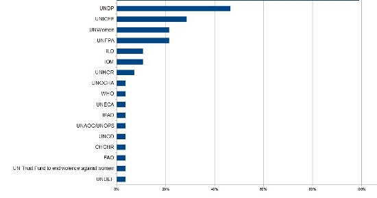 Out of the 28 respondents that have implemented projects with UN agencies, 13 (46%) did so with UNDP, eight with UNICEF, six each with UNFPA and UN Women, three with IOM & ILO, two with UNHCR and one each with the UN Trust Fund to End Violence against Women, FAO, OHCHR, UNOD, UNAOC/UNOPS, IFAD, UNECA, WHO and UNOCHA. Figure 4: UN entities having implemented projects with survey respondents (as percent of total survey respondents in programme countries that declare partnerships with the UN). The totals exceed 100% because several organizations have worked with more than one UN entity.