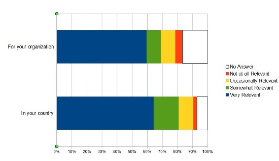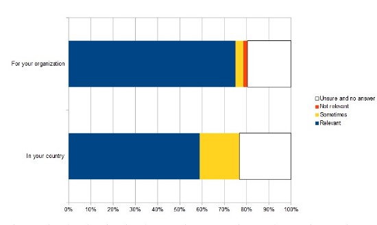 Almost half of the respondents commented on the UN pillars, evidencing their interest. Some organizations highlighted the interconnection between the pillars “because development leads to better enjoyment of human rights and to peace and security”. Another respondent called for “the above pillars [to be] more linked together in the work of UN”. A regional network from the Middle East highlighted the interconnection arguing that “the region is facing tremendous developmental challenges related to conflicts, authoritarian regimes, high concentration of refugees, failure of economic and social policies and shrinking civic space. This context requires changes in the approaches and shift in policies. UN interventions in the region are important in terms of engaging different stakeholders in dialogues around the topics, but the approaches are very much considerate of the priorities of States, which makes the discourse moderate.” An international women's organization commented that “while none of the pillars can stand on its own, the economic pillar is often the one that NGOs pay the least attention too. Social is always front and center especially for a large women's organization like I represent and the environment pillar has really been embraced by the younger generations .. but sadly it is only now that NGOs like mine are beginning to pay more attention to this pillar” (the economy). On Peace and Security An African organization argued that this pillar should be kept “at any price” because “development is not possible without it”. An organization focusing on people with disabilities wrote that “peace and security is very important” since “war and unrest fabricate persons with disabilities”. Similarly, a local organization working on access to water witnesses that in areas of conflict “many women and children do not have access to basic health care or safe water”. An Eastern European organization considers that “peace and security, perhaps inevitably, is more politicized”, and thus “probably more difficult to deal with”. On the other hand, an organization from Southeast Asia comments that, since “peace and security is not the main issue in [our country], NGOs' involvement is not essential”. On Human Rights An Eastern European organization commented that “We very much rely on the Human Rights pillar and we would like to see it reinforced, instead of what we are witnessing- attempts for weakening it”. An organization working on disabilities commented: “Some agencies, notably some more than others, simply do not understand the Convention on the Rights of Persons with Disabilities” and suggested that “some of the staff should be transferred to other areas if they do not understand the rights of persons with disabilities.” An organization from Central America demands “a gender and intersectional perspective” in human rights approaches, so that they reach the most vulnerable. On Development The Development pillar is seen by an organization in the Middle East as needing a reassessment “as the current approach has proven that it could not end hunger”. A local women's organization from Africa observed that, because of it being “linked to the annual increase in the Gross National Product (GNP), development favours the economic to relegate social issues and the fair distribution of income among the inhabitants of the same country to the background. … Since underdevelopment, is essentially the result of a situation of domination and exploitation, economic growth does not necessarily imply social progress”. With regard to humanitarian assistance/interventions, an organization from Southeast Asia comments: “Humanitarian activities have been the most important issue for all NGOs at some point in time. With [the country] reaching the middle-income status, NGOs' priorities have shifted to other areas, but humanitarian projects remain high on the agenda in remote parts of the country, in the areas affected by natural disasters and among marginalized populations.” How relevant is the UN?When participants in the survey were asked about the relevance of the UN in their countries and for their organizations they responded as shown. Figure 6: Relevance of the UN system (as percent of responses from programme countries)