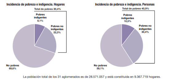 El porcentaje de hogares por debajo de la línea de pobreza (LP) alcanzó el 30,4%; en estos residen el 40,9% de las personas. Dentro de este conjunto se distingue un 8,1% de hogares por debajo de la línea de indigencia (LI), que incluyen al 10,5% de las personas. Esto implica que, para el universo de los 31 aglomerados urbanos de la EPH, por debajo de la LP se encuentran 2.849.755 hogares que incluyen a 11.680.575 personas y, dentro de ese conjunto, 754.155 hogares se encuentran por debajo de la LI, e incluyen a 2.995.878 personas indigentes. Con respecto al segundo semestre de 2019, los indicadores muestran un aumento de la pobreza (+5,4 p.p.) y un aumento de la indigencia (+2,5 p.p.) para el conjunto de la población cubierta por la encuesta.