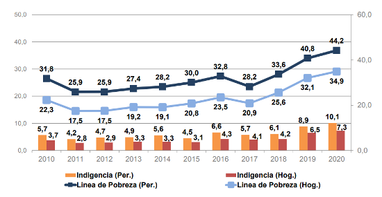 Por su parte el informe de la UCA “Deudas Sociales en la Argentina 2010-2020. Crisis del empleo, pobrezas y desigualdades estructurales en el contexto COVID-19” afirma que el 34,9% de los hogares y el 44,2% de las personas se encuentran por debajo de la línea de la pobreza al cierre del tercer trimestre del año, por encima del 32,1% y 40,8% registrado en igual período de 2019, en un contexto en el que resultó determinante la pandemia de coronavirus y en la que los números hubiesen sido mayores si el Estado no implementaba medidas de ayudas para enfrentar la situación.3