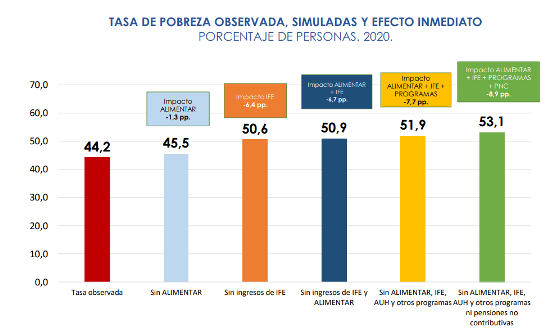 El informe de la Encuesta de la Deuda Social Argentina (EDSA) afirma que sin la AUH, el IFE, la Tarjeta Alimentar y el resto de los subsidios, la indigencia hubiera sido el doble y la pobreza hubiese trepado al 53%. Estos guarismos serían parte de un proceso que lleva diez años de estancamiento, con tres años de caída", entre 2018 y 2020.
