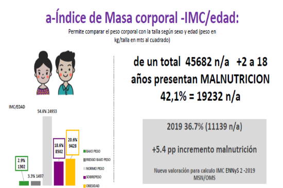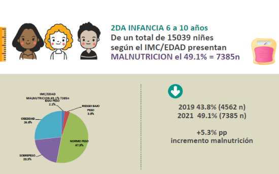 Algunos resultados generales del IBSN 2021 según IMC/EDAD indican que en la primera infancia (+ de 2 a 6 años), el 32,4% presenta malnutrición. En el 2019 era un 27,4%, por lo que se incrementó 5 puntos porcentuales la malnutrición en esta etapa. El mayor grado de malnutrición, se evidenció entre quienes tienen 6 a 10 años, ya que de acuerdo al IMC/EDAD el 49,1% presenta malnutrición. En el 2019 era un 43,8%; es decir, en casi dos años en este rango de etario la malnutrición se incrementó 5,3 puntos porcentuales.