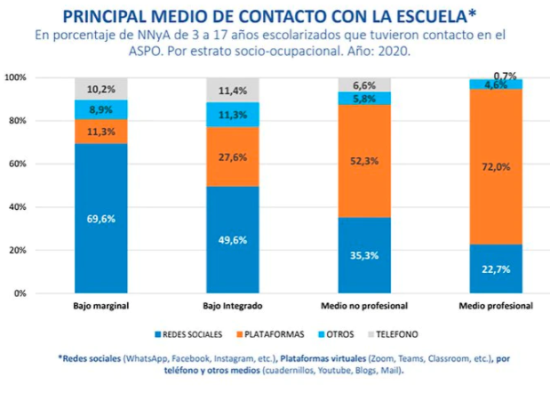 Un informe reciente de la UCA y Fundación Cáritas demuestra las diferencias en la calidad de la educación a distancia. En los estratos más bajos, WhatsApp es la principal herramienta de contacto con la escuela. Las plataformas virtuales tan solo alcanzan al 11% de los hogares. Mientras que en la capa “medio profesional”, el 72% de los chicos trabaja con Zoom o Google Meet.
