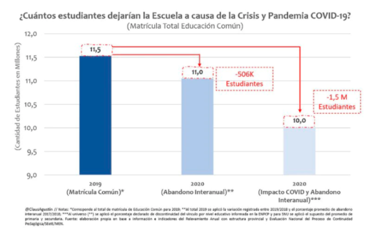 Por su parte, el investigador Agustín Claus (FLACSO), proyectó en 2020 cuántos chicos se perderían a raíz de la pandemia. La estimación, que definió como moderada, le dio al menos 1.5 millones que abandonarían el sistema educativo. Ya en 2021, si se lo compara con otros países de la región, como Brasil o México que ya difundieron algunas cifras oficiales, el modelo estimativo fue muy preciso. El cálculo que realizó toma en cuenta dos factores: el promedio de abandono interanual por nivel y las respuestas que el Ministerio de Educación recabó en la evaluación de continuidad pedagógica. Con ambas variables, arribó a la proyección de una pérdida de 1.5 millones en la educación común, es decir, un 13% menos de alumnos en los tres niveles obligatorios (inicial, primaria y secundaria) y en el superior no universitario.