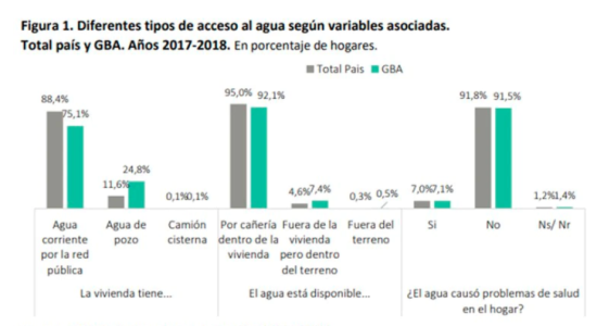 Según un informe del Observatorio Social de la Universidad Católica Argentina (UCA) y la Defensoría del Pueblo Bonaerense, el 75% de las viviendas del Conurbano bonaerense tienen acceso al agua corriente de red, lo que la ubica 13,7 puntos por debajo del promedio nacional, que es del 88,4 por ciento, según datos del Instituto Nacional de Estadística y Censos (Indec).9